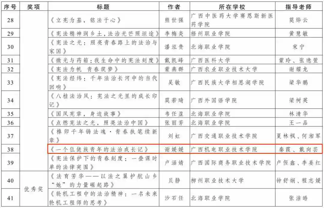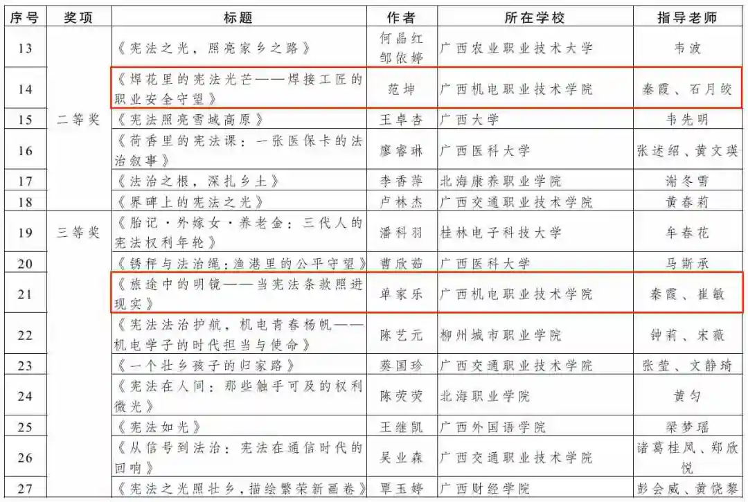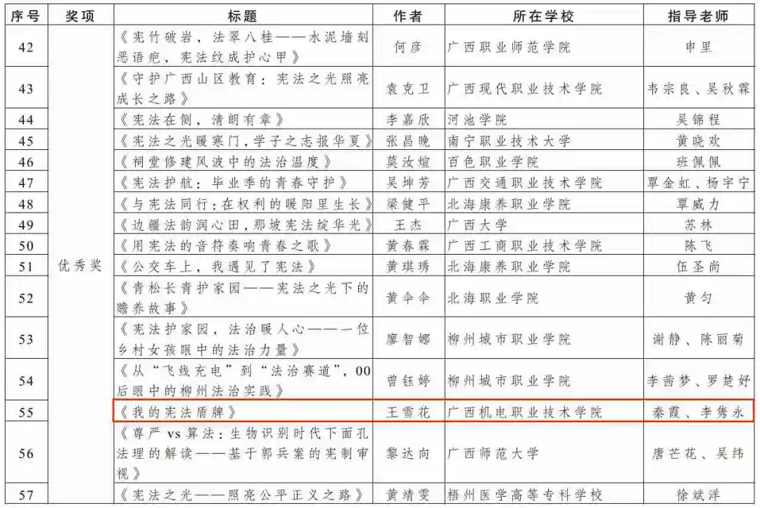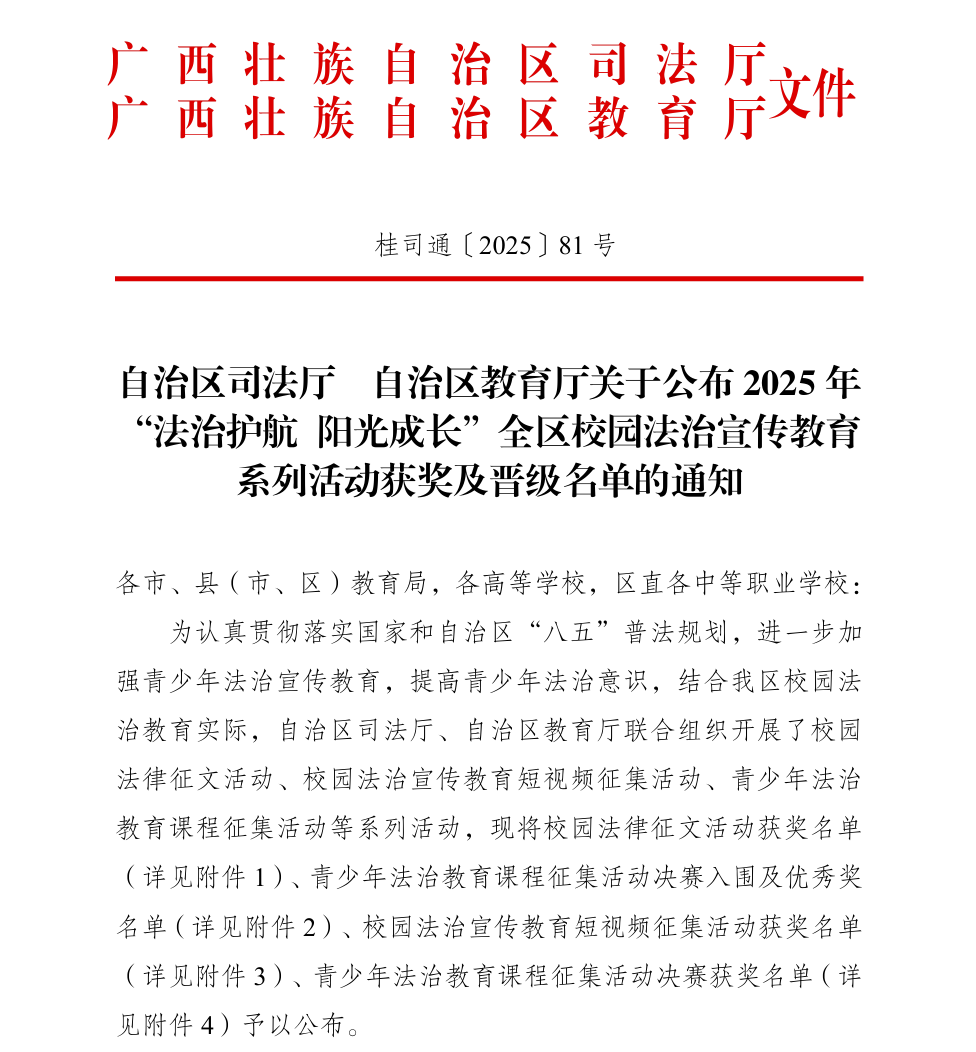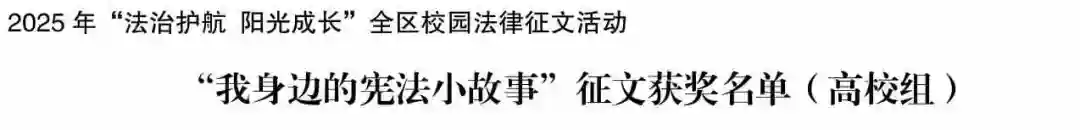 8月5日,广西壮族自治区司法厅、广西壮族自治区教育厅公布了2025年“法治护航 阳光成长”全区校园法治宣传教育系列活动获奖及晋级名单,AC米兰在全区校园法律主题征文活动“我身边的宪法小故事”(高校组)中斩获佳绩,荣获二等奖1项、三等奖2项、优秀奖1项。