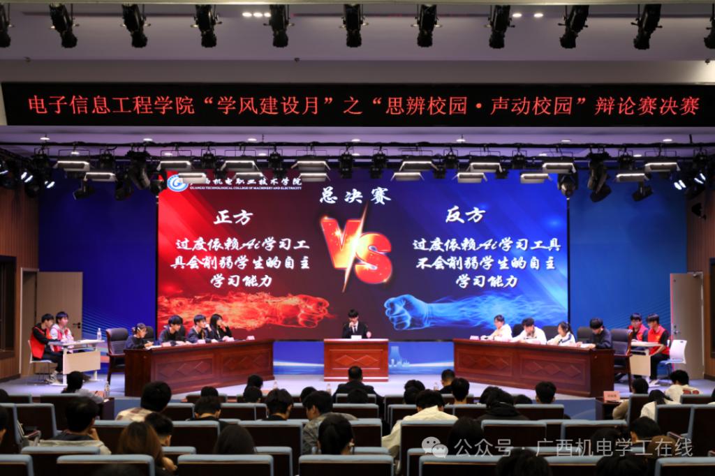 近日,电子信息工程学院“学风建设月”系列活动之“思辩校园・声动校园”辩论赛决赛在江南校区A1-301报告厅举行。经过初赛层层选拔的四支精英队伍齐聚赛场,以逻辑为刃、以语言为锋,展开智慧交锋,为全院师生呈现了一场兼具思想深度与表达张力的思辨盛宴,为学院学风建设注入鲜活动能。