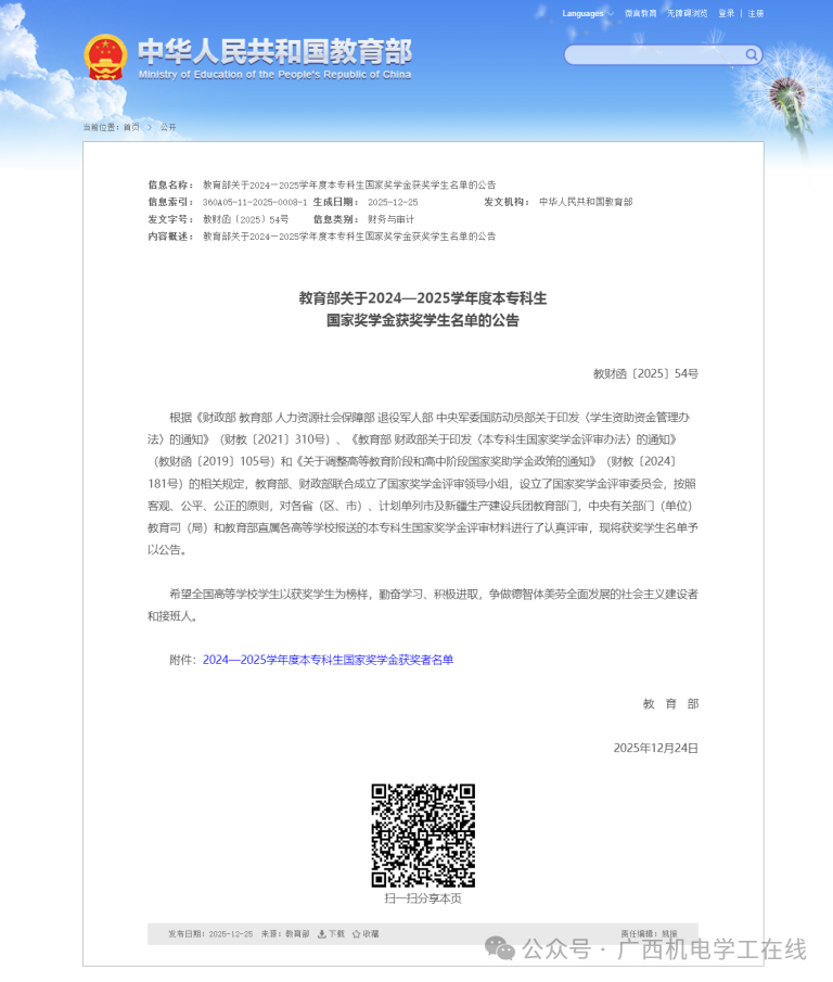 教育部关于2024—2025学年度本专科生国家奖学金获奖学生名单的公告