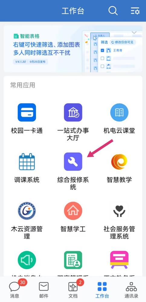 企业微信→工作台→综合报修系统→填写报修单