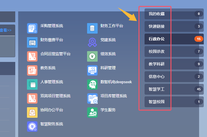 2.方式一:进入“智慧校园”,点击右边菜单栏,找到需要的业务系统。
