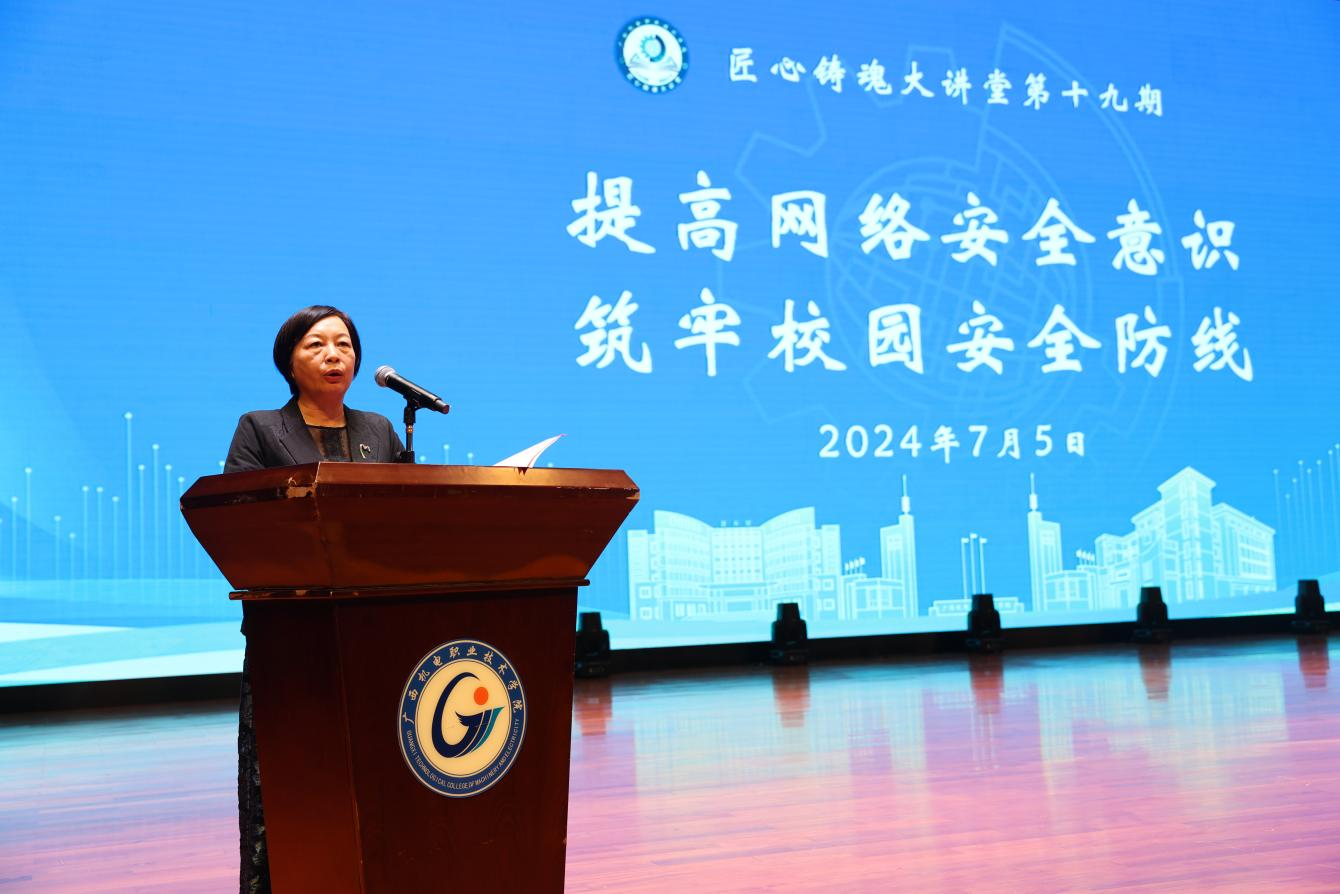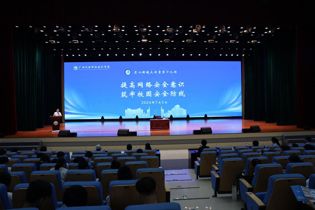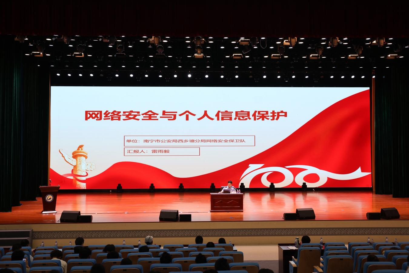 为深入学习贯彻习近平总书记关于网络强国的重要思想,切实增强师生的网络安全意识,7月5日,AC米兰在弘毅楼大礼堂举办“匠心铸魂大讲堂”(第十九期)“提高网络安全意识 筑牢校园安全防线”专题报告会,邀请南宁市公安局西乡塘分局网络安全保卫大队电子数据鉴定室负责人雷雨毅、南宁市西乡塘区人民检察院员额检察官钱积丰为师生作报告。学校党委副书记程云燕、中国电信南宁市西乡塘区分公司总经理廖春玲出席报告会。
