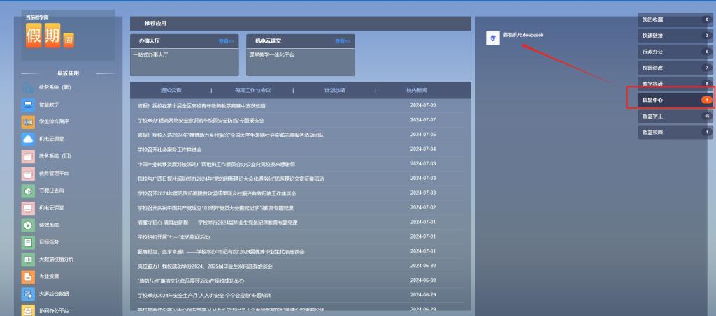 DeepSeek大模型服务的上线运行是学校推进教育数字化和智能化发展的重要举措。学校将以此为契机,进一步推进学校数据治理,不断加强智能基础设施建设,将智能服务与校内业务系统深度融合,借助本地化部署的DeepSeek大模型,聚焦学校教、学、研、管、评、服等领域,着力创新打造DeepSeek+AI助手,为全面提升教育教学、科学研究和管理服务效能提供有力支撑。教学方面,DeepSeek将协助教师们提供个性化教学方案,分析学生学习进展,辅助教学决策;科研领域,深度学习模型将优化数据处理流程,支持科研人员进行高效的文献检索、数据挖掘等工作;在管理方面,DeepSeek大模型的应用将帮助学校各级管理部门实现数据驱动的决策,提升行政效率和服务质量。