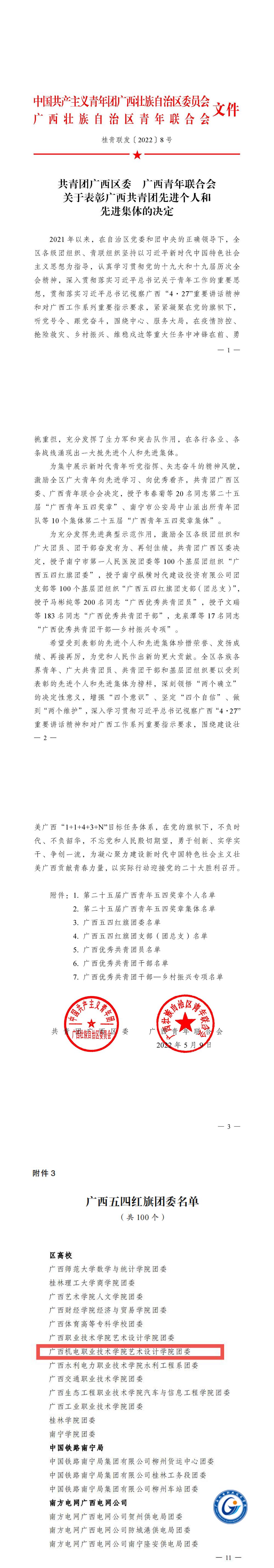 近日,共青团广西区委 广西青年联合会印发《关于表彰广西共青团先进个人和先进集体的决定》(桂青联发〔2022〕8号),我院团委荣获2021年度“广西五四红旗团委”称号。