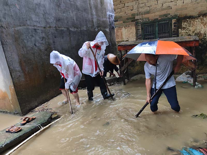 迎雨而上,争当防汛战斗员。近日,旧门村出现持续强降雨,岭头屯因公路扩建施工原因,导致排水不畅,村屯道路及少数民房已被积水淹没。为保证人民群众生命财产安全,我院派驻该村的第一书记李育好迅速行动,不怕困难,冒着大雨奔走在防汛第一线,在风雨中彰显责任担当,积极发挥党员先锋模范作用。在暴雨中查看水情,组织人员开展转移群众、水道垃圾清理,泄水口疏通等防汛排险工作,并与支书商议联系公路扩建单位,调用挖机扩大排水口,以快速解决积水问题,排除群众生命及财产的安全隐患。同时安排村“两委”干部劝阻群众照看好自家小孩,注意安全,不要围观。