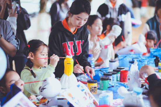 活动中,志愿者首先向大家分发石膏娃娃、画笔、颜料等所需材料和工具,讲解手绘石膏的制作流程、技巧与注意事项,引导和鼓励大家自由创作。在志愿者的指导下,学生和孩子们用手中的画笔,在石膏娃娃上描绘绚丽的色彩,一番创作过后,“艾莎公主”“叮当猫”“小黄人”等各种造型的石膏娃娃被五彩缤纷的画笔披上了鲜艳的外衣,一个个精致小巧的石膏娃娃便呈现在眼前。