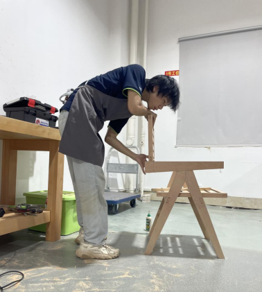 比赛现场,韦成浩在认真制作家具