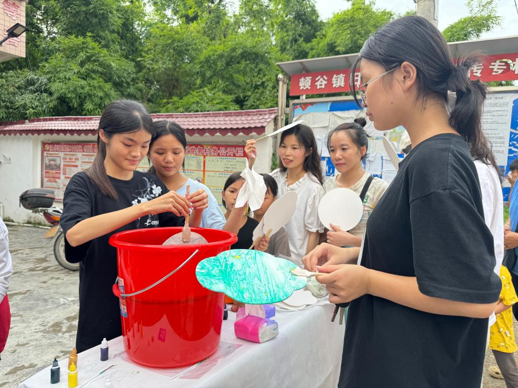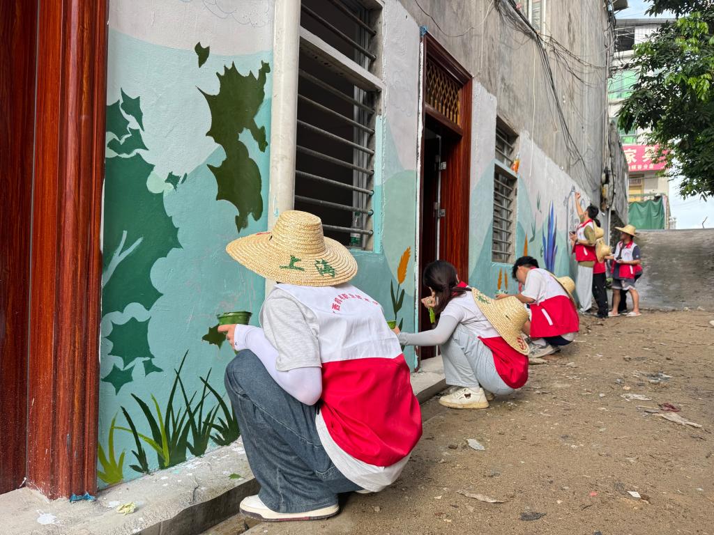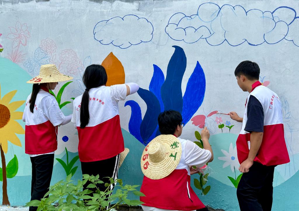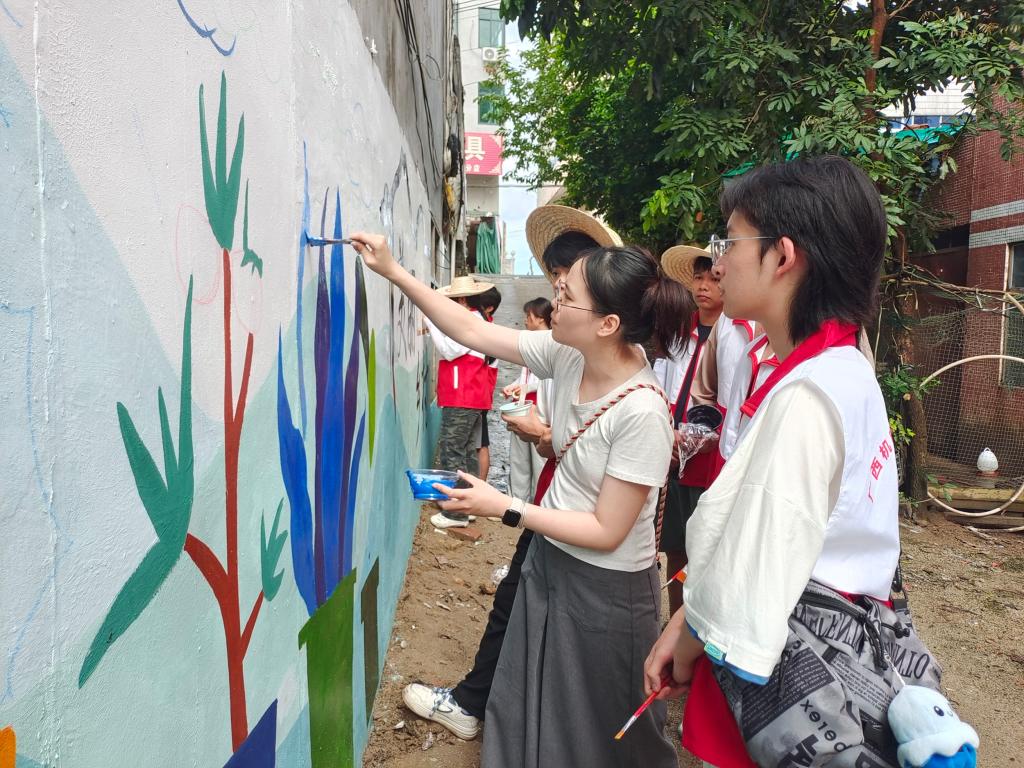 为深入学习党的二十届三中全会精神,推进乡村文化振兴,工业设计学院于7月15日-21日组织了一支由18名师生组成的社会实践团,奔赴学院定点结对帮扶村——玉林市博白县顿谷镇旧金村,开展“多彩墙绘绿美乡村·非遗漆扇传承文化”大学生暑期“三下乡”社会实践活动。在为期七天的实践活动中,实践团成员发挥设计专业优势,助力绘就全面推进乡村振兴的壮美画卷。