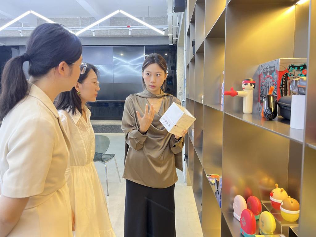 图10 毕业生(右二)介绍陶瓷设计产品