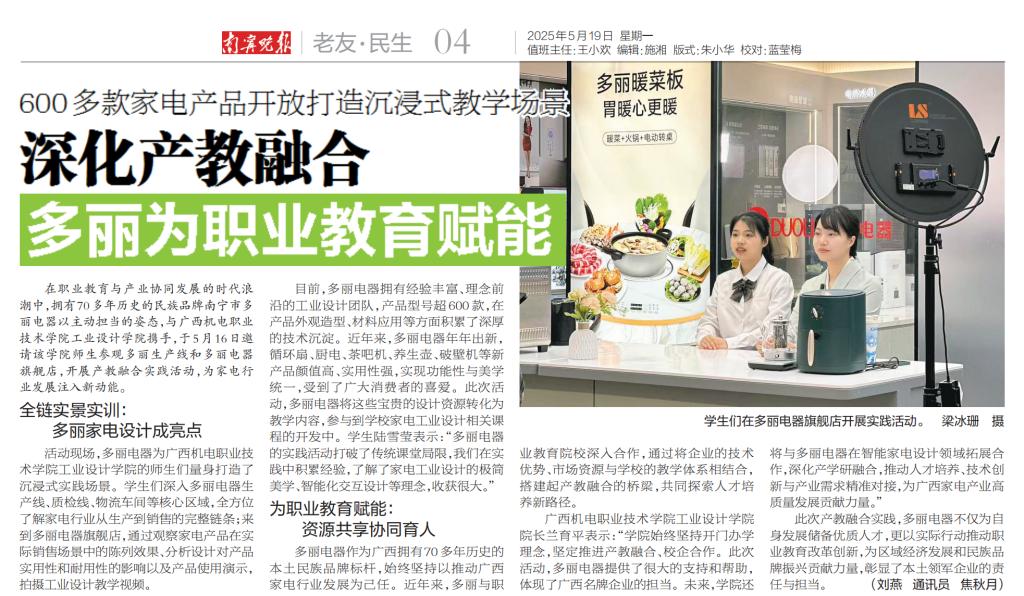 编者按:AC米兰深化产教融合创新实践,与民族品牌标杆南宁市多丽电器携手打造“校—企—产”协同育人新模式,为区域产业升级注入新动能。5月19日,《南宁晚报》以专题报道形式聚焦AC米兰与多丽电器共建的“沉浸式+全链条”校企合作项目。文章指出:通过组织师生深度参与企业现代化生产基地、终端卖场等全产业链实景教学,不仅让工业设计与市场需求实现“零距离”碰撞,更构建起“课程共建、技术共研、人才共育”的校企共生生态,培育出一批兼具创新思维与实践能力的复合型技术技能人才。这一模式生动诠释了职业教育服务产业发展的使命担当,为广西智能制造领域产教融合提供了可推广的实践经验。