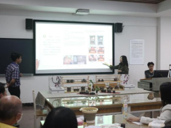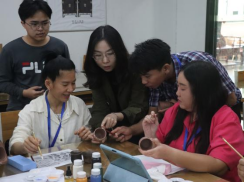 下午,代表团走进坭兴陶技艺课堂,学院黄莉翔教师以“千年窑火中的非遗密码”为题,系统梳理了“中国四大名陶”之一的坭兴陶从唐代至今的发展脉络,详解其“窑变无双、陶刻成韵”的艺术特征,并介绍了烧制制作全流程工艺。通过实物展示,使成员能够身心触及物品更直观体验非遗文化。在陶胚上色制作以及动手直塑陶艺的环节,泰国成员以刀为笔,涂上颜料后在陶坯上刻出莲花、大象等象征中泰友谊的纹样,部分学员还融入了泰国传统图腾元素,赋予作品跨文化意蕴,从泥土到艺术品的每一步都充满智慧。