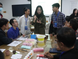 学院通过非遗文化搭建“技艺共研、情感交融”的立体化交流平台。在冯甜、黄莉翔两位老师指导下,泰国学员通过扎染的"几何解构"感知东方审美哲学,借助坭兴陶技艺的"型色嬗变"体悟工匠精神。特别设计的"中泰友谊纹样创作"环节,使传统技艺焕发现代生命力,学员创作的《澜湄织韵》、《象屿陶语》等作品成为跨文化对话的生动载体。泰国罗勇技术学院领队表示:“这些承载两国友谊的艺术品,是职教合作促进民心相通的最佳见证。”