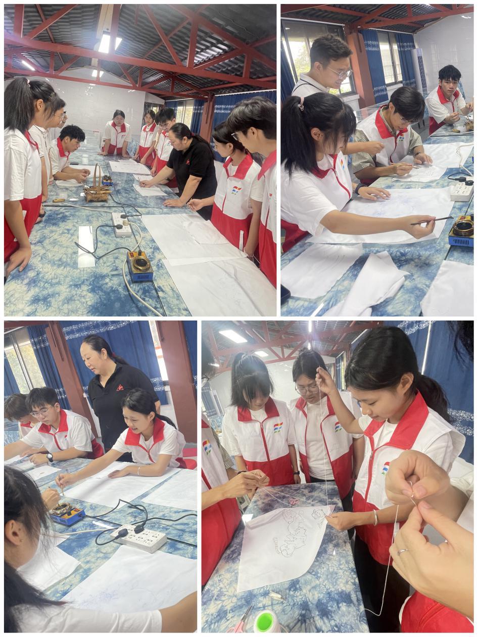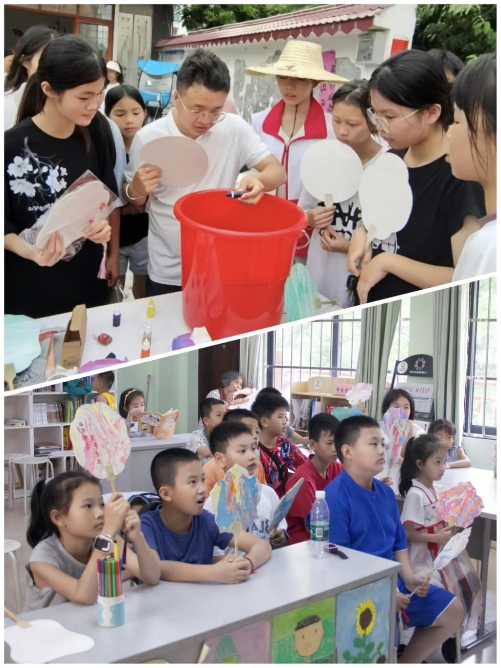 实践期间,团队走进永安村小学及广西橄榄堡乐园研学点,开展"非遗小课堂"主题支教活动。通过漆扇制作、非遗故事会等形式,为百余名儿童普及扎染、蜡染技艺,赠送画笔、扇子等文创物料。孩子们在动手实践中感受传统文化魅力,一颗颗"非遗传承"的种子悄然生根。"看到孩子们举着自制漆扇欢呼,我们深刻体会到美育对乡村文化的滋养用。也有效提升了永安村及美丽南方景区的文化知名度。
