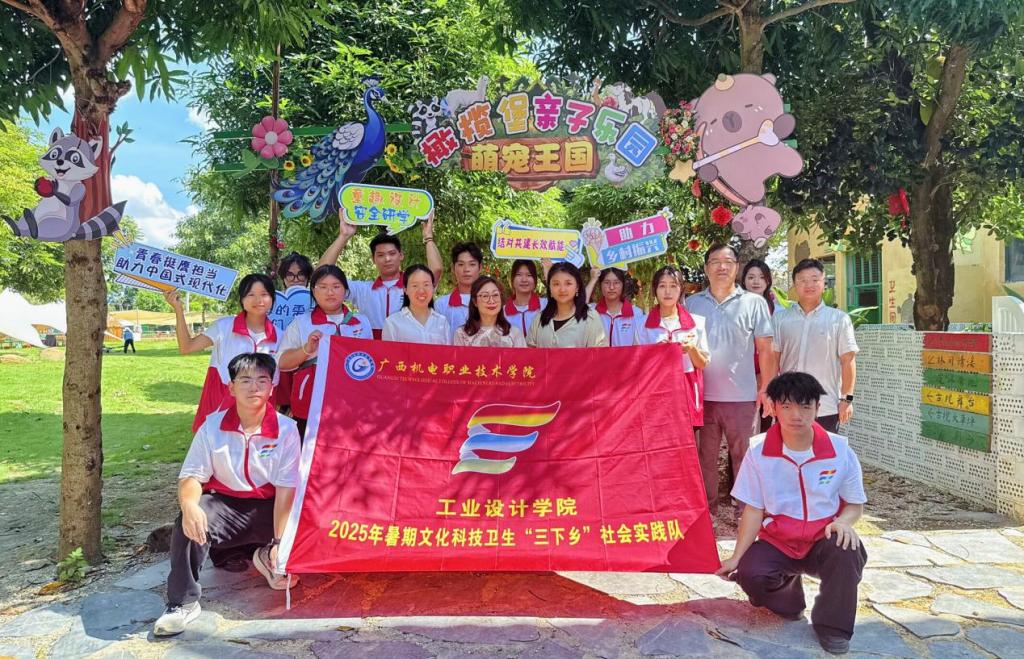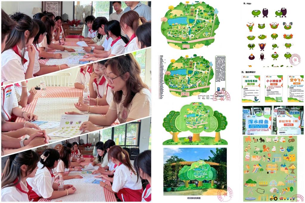 7月15至17日,针对和安村、永安村研学点及广西橄榄堡乐园文化旅游投资有限公司的实际需求,工业设计学院"非遗智绘"实践团通过实地勘察景区导视系统、研学物料及空间布局,精准诊断出"文化标识缺失、儿童体验单一、客流吸引力不足"等发展痛点。在此基础上,团队立足专业优势,创新性提出"非遗+文创+产业"的融合方案,通过7月18日至27日的集中攻坚,系统完成三大实践成果:设计融合非遗纹样与壮族元素的模块化导视系统40余套,配套输出标准化设计规范手册及施工图,有效解决景区"找不着路、看不懂文化"的难题;开发内置AR非遗卡片扫描功能的童趣化"非遗探索包"及活动手册,通过3D动画让儿童直观感受纹样魅力,丰富研学体验维度;打造具有壮族特色的品牌IP形象,并制定衍生文创产品应用方案,助力景区文化IP化运营与产业升级。8月1日,团队与广西橄榄堡乐园正式签署结对共建协议,明确"设计工作坊常态化、成果反馈动态化"的合作机制,公司负责人高度评价设计成果"既保留文化根脉,又贴合现代审美,为景区升级提供了专业支撑"。
