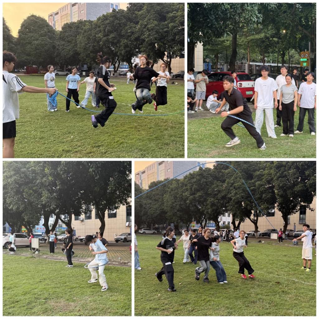 活动现场绿草如茵,气氛热烈非凡。在“螃蟹跑接力赛”赛道上,同学们两两一组,模仿螃蟹的跑法,双腿张开如蟹钳般疾行,腰间的呼啦圈稳稳旋转。每一步同步的节奏里,都藏着满格的默契,他们用欢快的步伐传递着青春的活力。“同心鼓垫排球”区域,各宿舍联队紧密配合,拉紧鼓绳。每一次精准的颠球,都迸发出强大的团队力量。八人拉绳控鼓的设计,完美诠释了“一站式”社区里多元主体协同发力的育人理念,让同学们在协作中深刻领悟“拧成一股绳”的集体智慧。“跳绳接龙”赛场更是热闹非凡,长绳在空中快速翻飞,同学们鱼贯跃过,动作轻盈敏捷。欢笑声与加油声交织在一起,奏响了一曲激昂的青春乐章,将现场气氛推向了高潮。