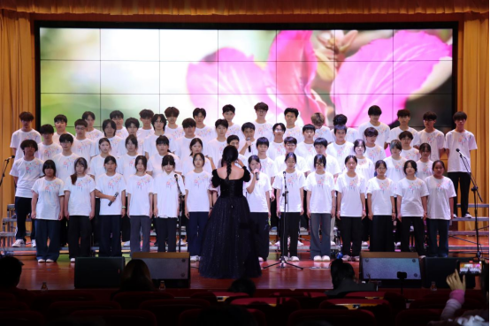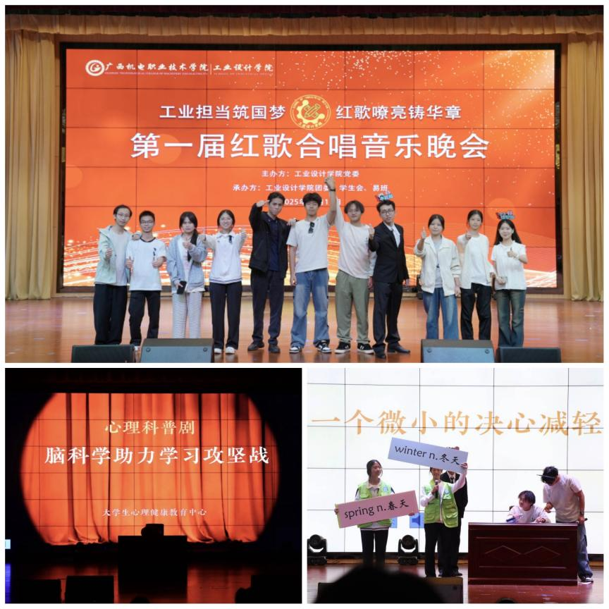 11月11日晚,工业设计学院“工业担当筑国梦,红歌嘹亮铸华章”红歌合唱音乐晚会在博远楼小礼堂圆满落幕。学院党委副书记、副院长黄梨锦,团委书记李晶晶及全体辅导员、班主任与学院全体学生齐聚一堂,共同见证这场融合爱国情怀与工业使命的青春盛宴。晚会以“工业报国”为主线,通过红歌演绎、独唱表演、心理科普剧等多元形式,将家国情怀与专业追求深度融合。璀璨灯光下,大屏滚动播放主题标语,随着动漫2502班《紫荆花盛开》的旋律响起,晚会正式拉开帷幕。