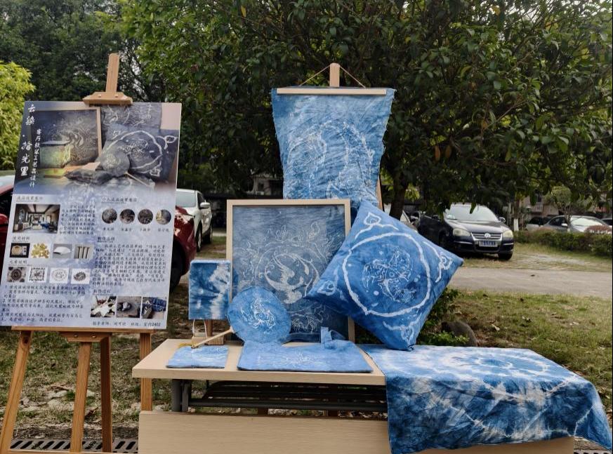 展区内,各类融合非遗元素的家居作品吸引了不少师生驻足观赏,其中扎染小组的作品尤为亮眼。据了解,小组成员创新采用“手绘+AI软件”结合的方式,对苗族传统鱼纹、蝴蝶纹、回纹等纹样进行解构重组,将古老纹样提炼为适配现代审美的极简线条;随后运用植物染工艺反复浸染织物,使成品在蓝白渐变的色调中自然晕染出非遗技艺特有的肌理质感。