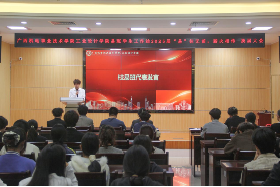校易班代表随后上台发言,分享了校易班的工作经验与发展思路,表达了对工业设计学院易班学生工作站未来发展的美好祝愿,并期待双方进一步加强交流合作,共同打造优质校园育人平台。紧接着,第一届易班学生工作站负责人何承远作工作报告,全面回顾了任期内工作站在网络思政内容传播、校园文化活动策划、学生服务保障等领域的工作成效,客观剖析了现存不足,并结合易班网络思政发展趋势,为新一届工作站工作方向提出建设性建议,为工作传承与创新奠定坚实基础。