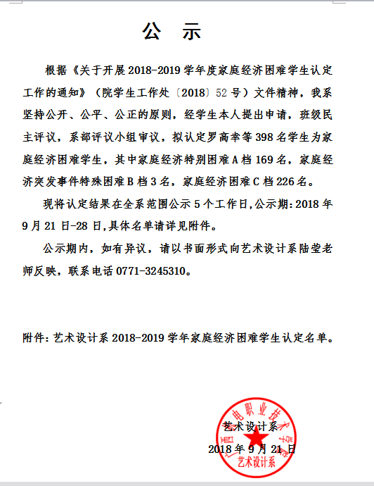 艺术设计系2018-2019学年度家庭经济困难学生认定名单公示