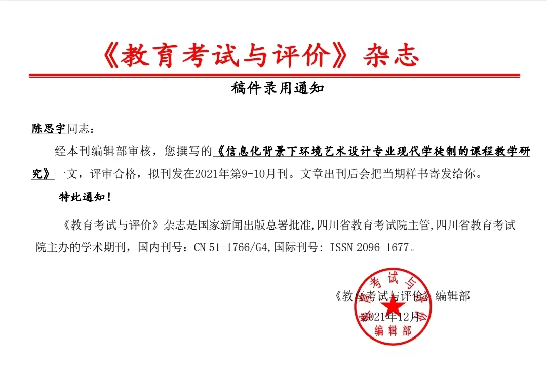 论文发表: 《信息化背景下环境艺术设计专业现代学徒制的课程教学研究》