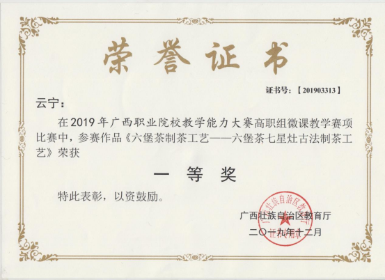 1、2019年广西职业院校教学能力大赛高职组微课教学赛项比赛“一等奖”。