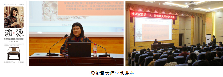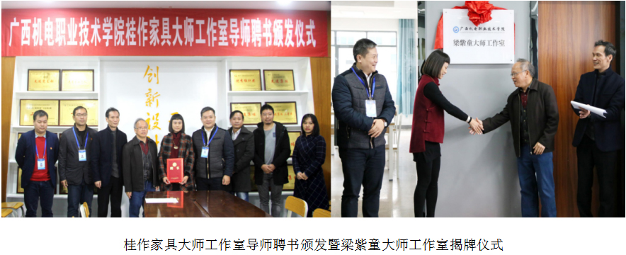 1.桂作家具大师工作室:建设面积120平方米,配备专业电脑、投影空调、绘图桌椅等设备,聘请广西工艺美术大师梁紫童女士担任工作室导师,主要开展桂作家具的理论研究、创新设计和教育实践等工作。