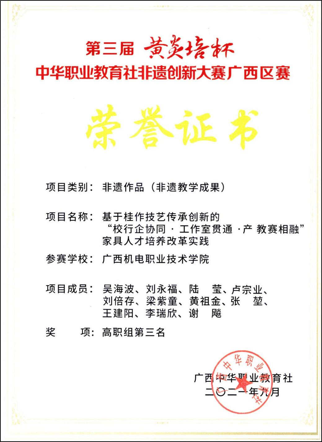 第三届“黄炎培杯”中华职业教育社非遗创新大赛广西区赛第三名