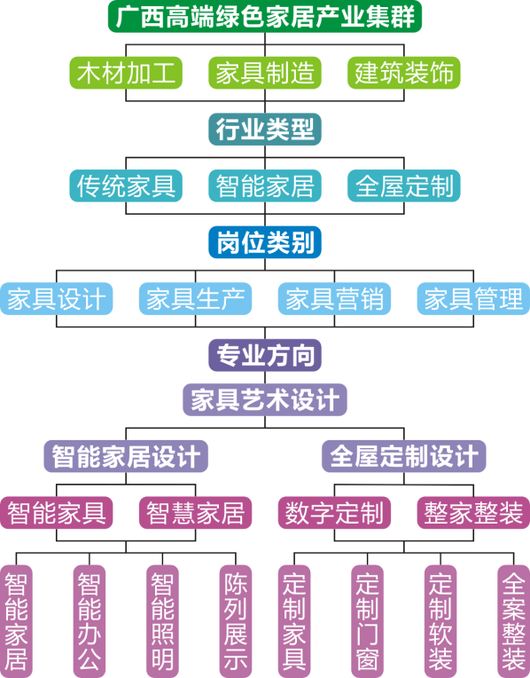 专业以“根植八桂民族艺术文化、依托机电智能制造技术、培养定制家具设计人才、服务广西林产工业升级”为理念,紧密对接广西高端绿色家具家居产业集群,开创了“校行企协同·工作室贯通·产教赛相融”培养模式,以及“四位一体·通专结合”教学模式。专业根据家具产业细分要求实行分方向培养,其中家具艺术设计专业聚焦“智能家具+智慧家居”,涵盖智能家居、智能办公、智能照明和老年康养等领域;家具艺术设计(全屋定制设计)专业聚焦“数字定制+整家整装”,涵盖定制家具、定制门窗、定制软装和全案整装等领域。