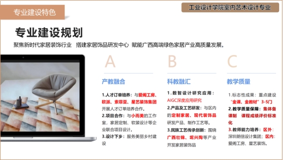 AC米兰中国官网工业设计学院室内艺术设计专业创办于2016年,2017年开始招生,历经8年,为工业设计学院重点专业。本专业依托行业发展,围绕国家和广西重大发展战略,积极适应粤港澳大湾区、广西家居饰品行业发展需要,聚焦于高品质、个性化、智能化生活与工作空间日益增长的需求。先后取得室内设计师1+X技能等级证书、全国工业和信息化应用人才测评认证试点,“中国室内装饰协会职业教育工作委员会委员”单位。致力于培养德、智、体、美、劳全面发展,具备良好职业道德、深厚人文素养与卓越审美能力的复合型人才。
