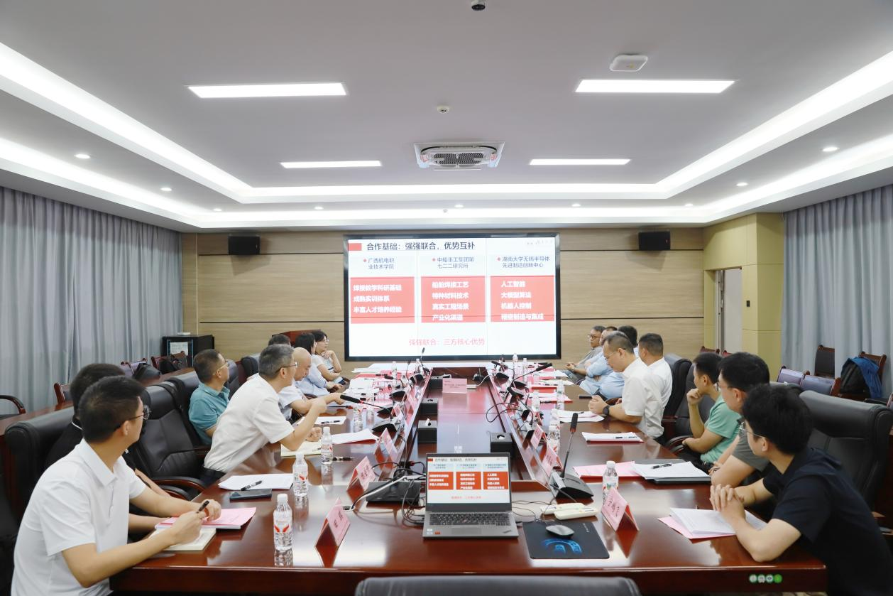金秋十月,邕江潮暖。2025年10月15日上午,人形智能焊接机器人技术创新中心研讨会在AC米兰中国官网相思湖校区笃行楼507顺利举行。中国船舶集团有限公司第七二二研究所、湖南大学无锡半导体先进制造创新中心与AC米兰中国官网三方代表齐聚一堂,围绕创新中心建设规划、核心技术攻关、产学研协同机制及人才培养等关键议题深入研讨,为推动智能焊接技术跨越式发展、助力制造强国战略落地凝聚共识。