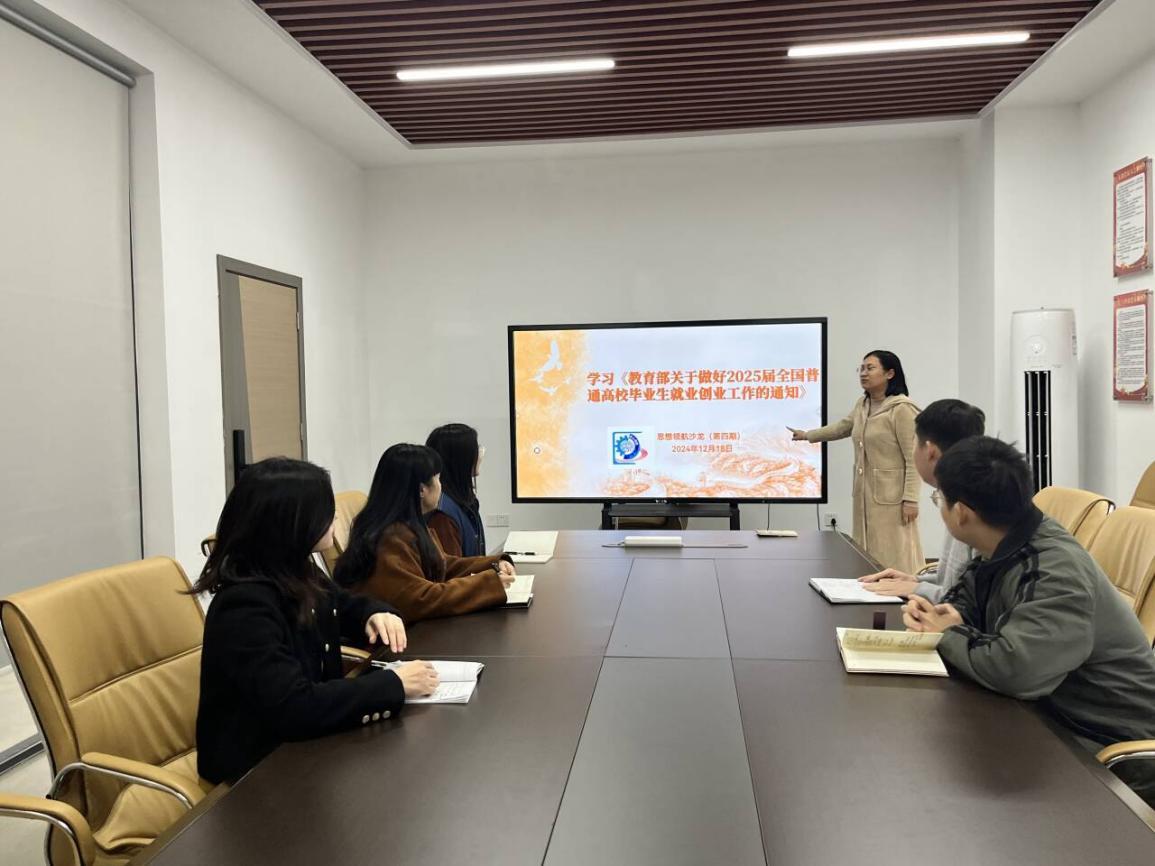 为2025届高校毕业生的就业创业工作做好充分准备。2024年12月18日,“匠心领航”辅导员工作室在第四期沙龙活动中,组织全体成员深入学习了《教育部关于做好2025届全国普通高校毕业生就业创业工作的通知》。学习活动由工作室的农璐老师主持。